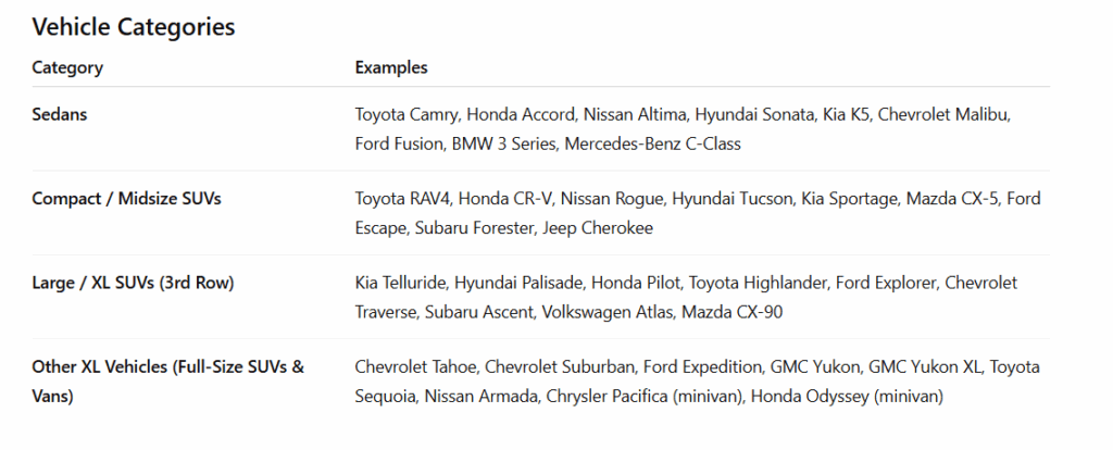 When it comes to detailing (or any service pricing), not all vehicles are created equal. The size and layout of the vehicle directly affect time, effort, and materials needed. That’s why we group them into clear categories: